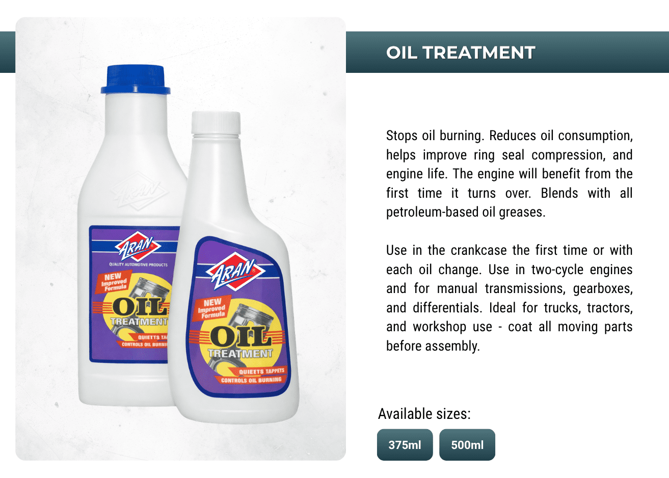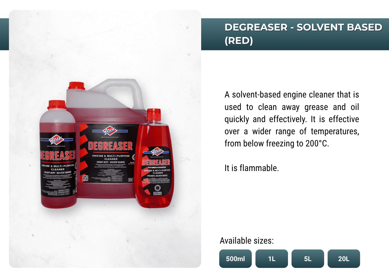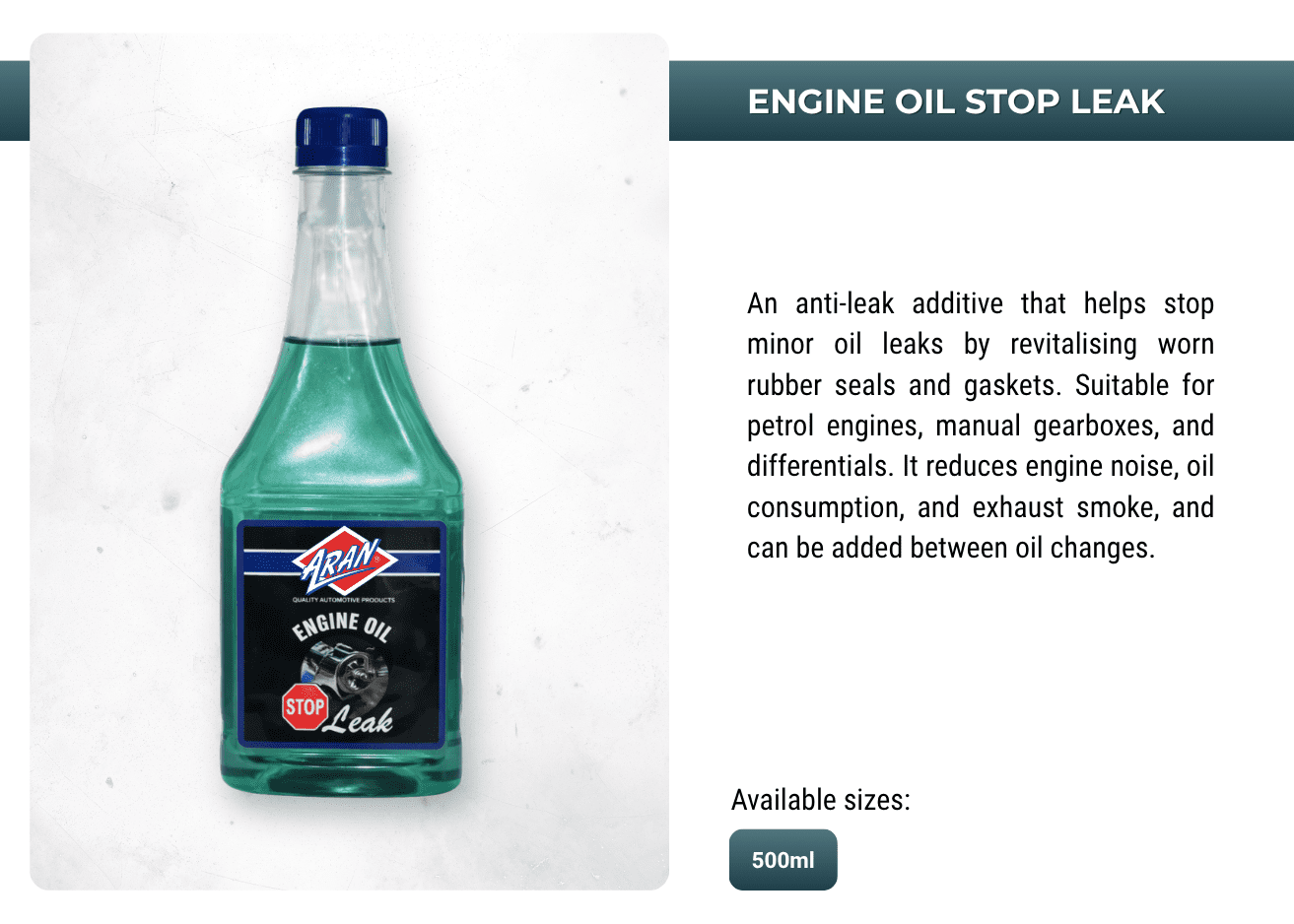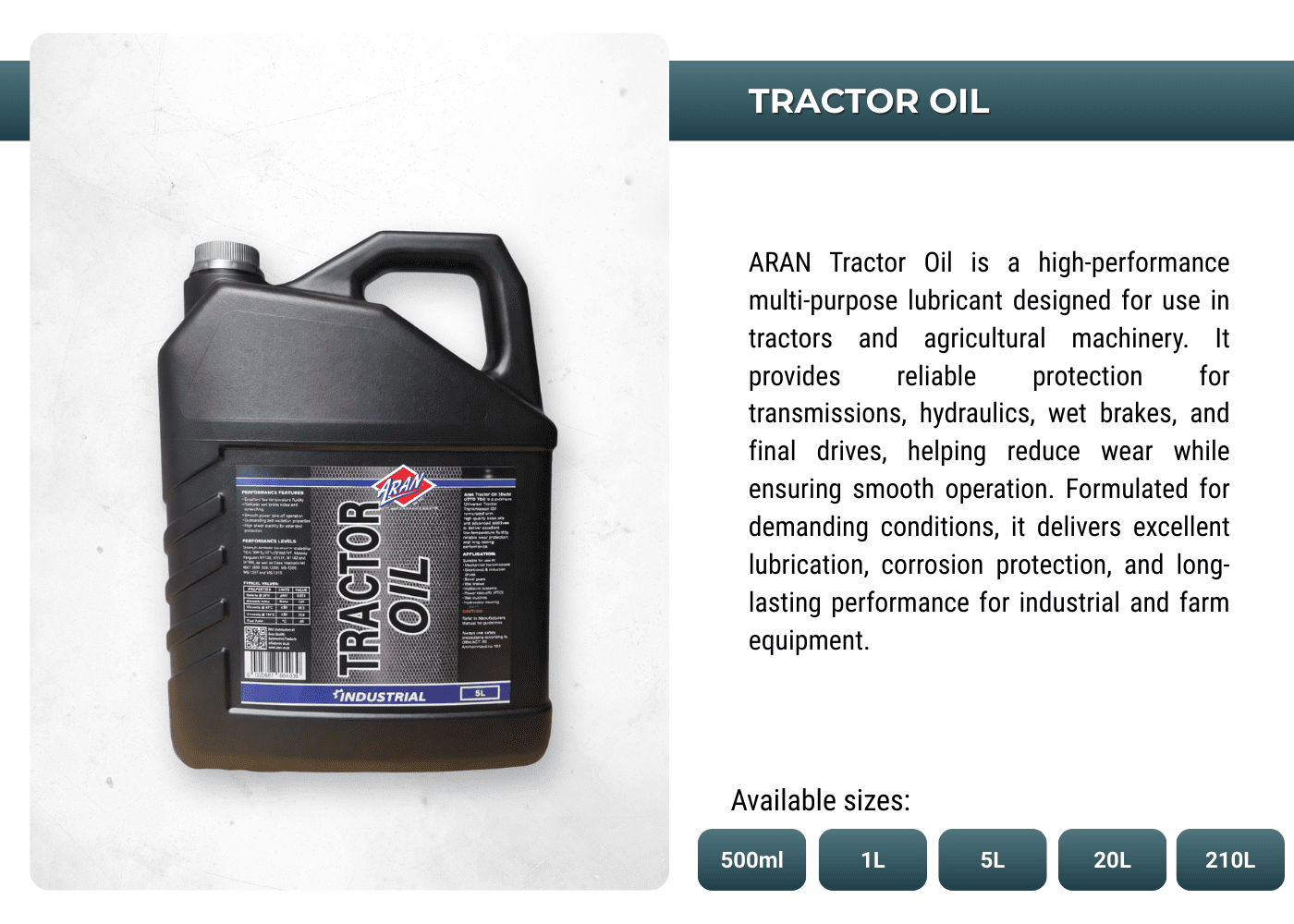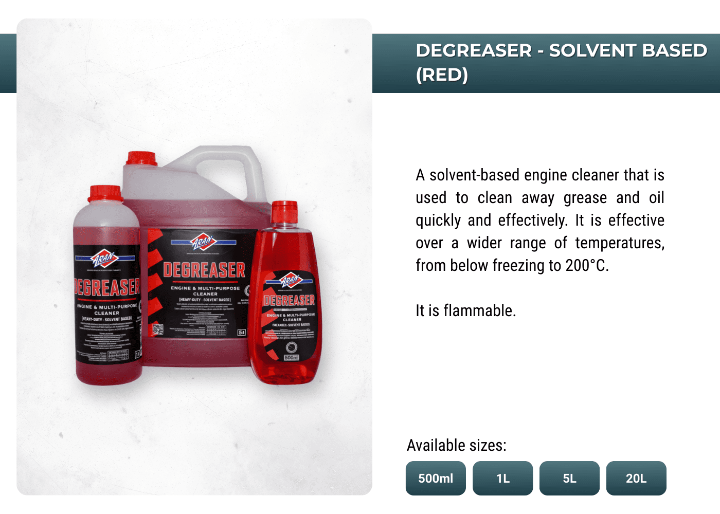 Powering performances with ARAN's extensive range of automotive and industrial additives, lubricants, sprays, anti-freeze, oils, greases, de-greases and more.