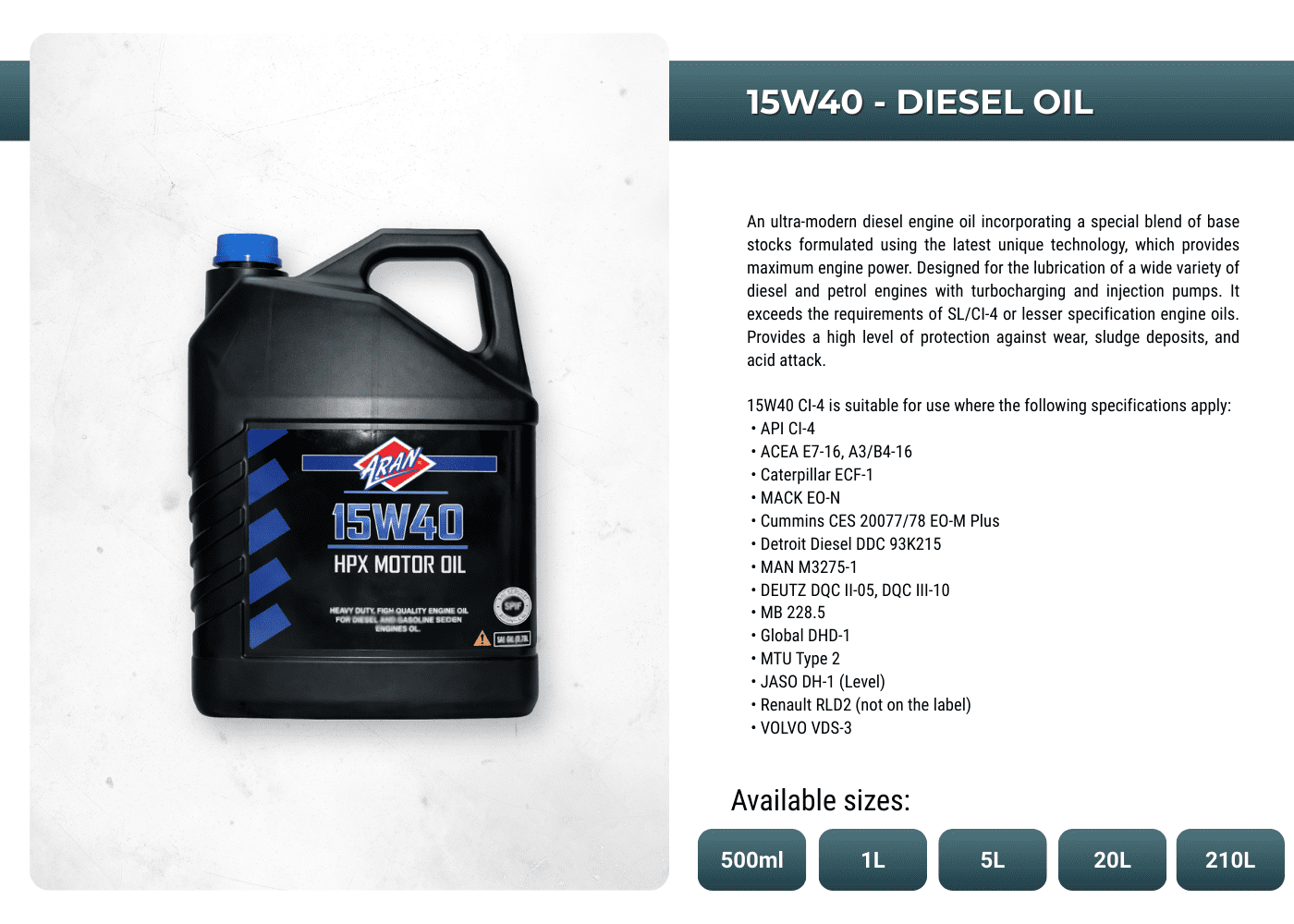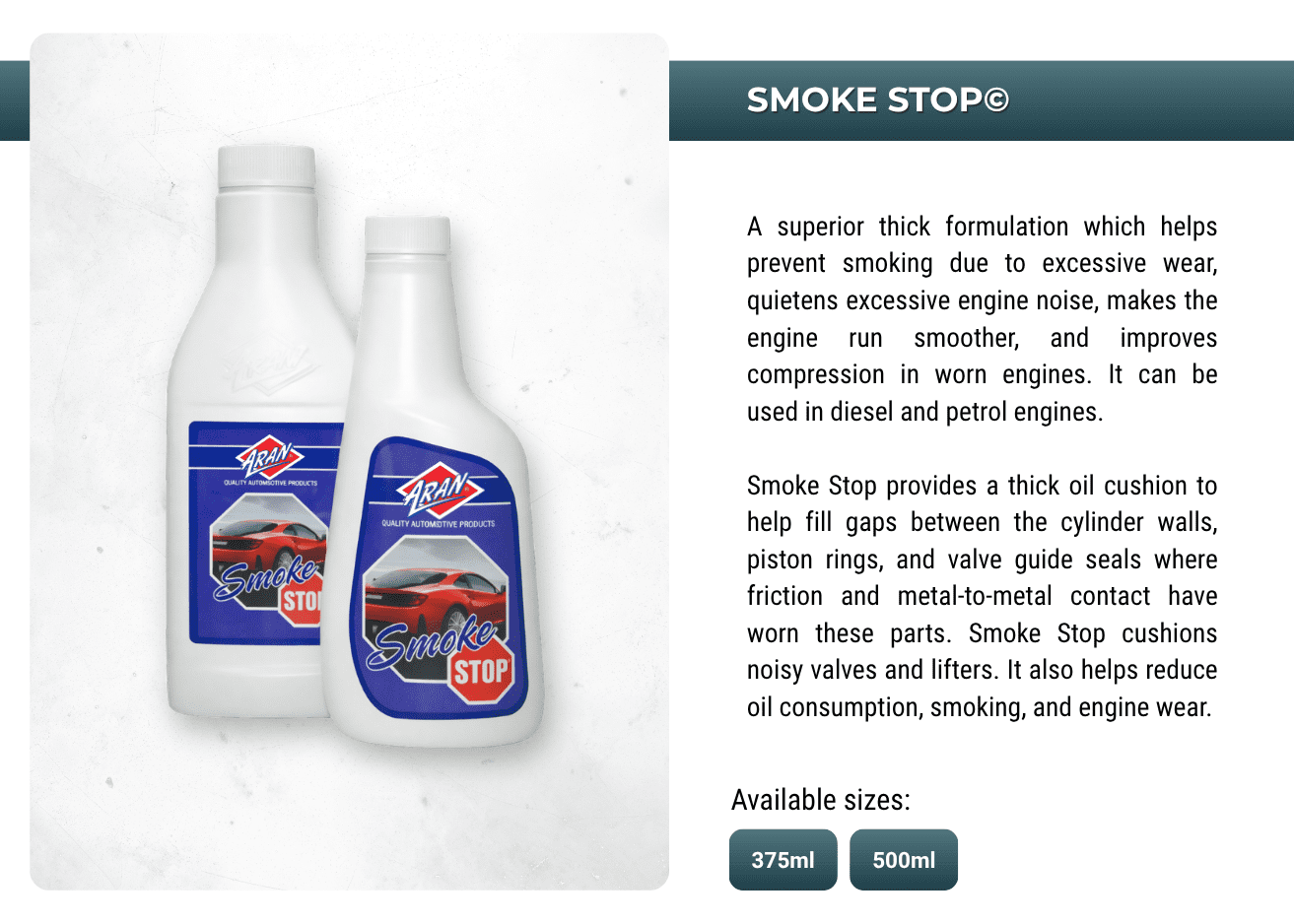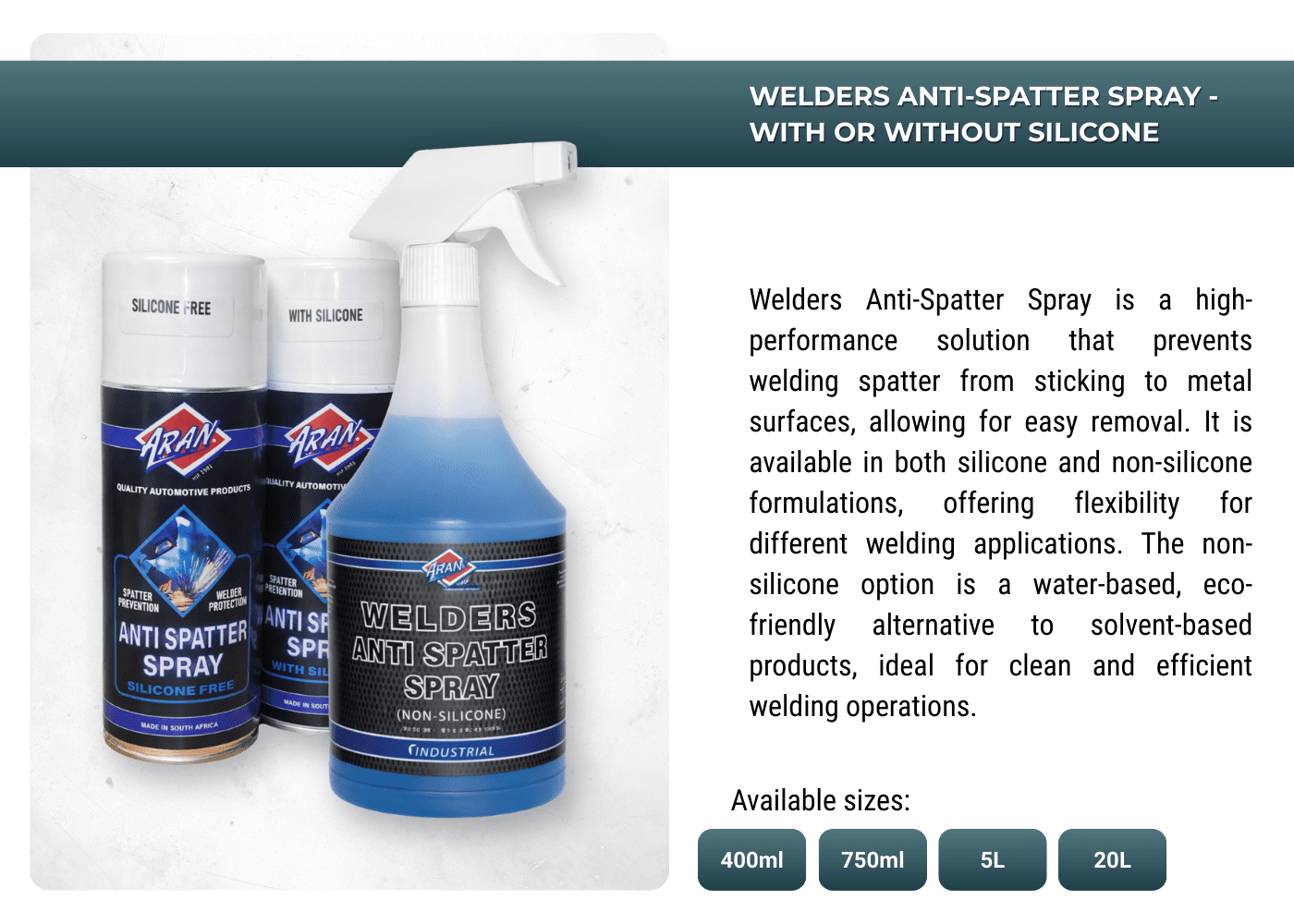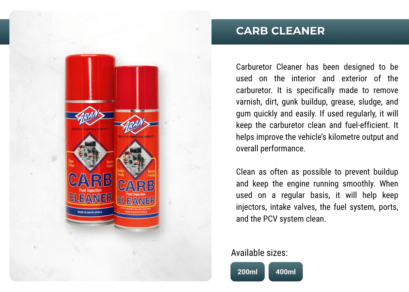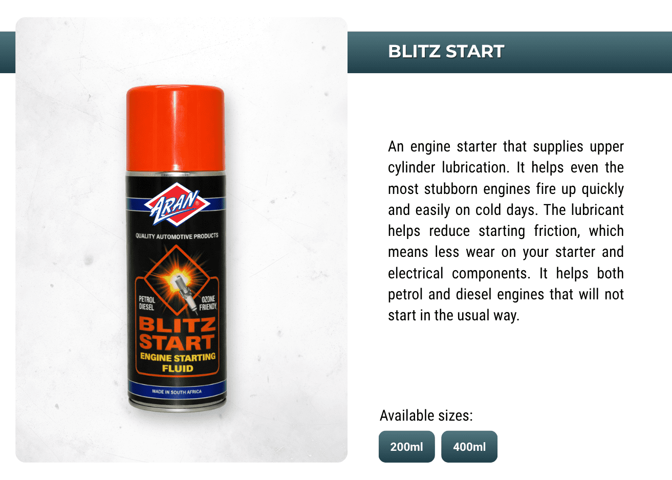 Powering performances with ARAN's extensive range of automotive and industrial additives, lubricants, sprays, anti-freeze, oils, greases, de-greases and more.